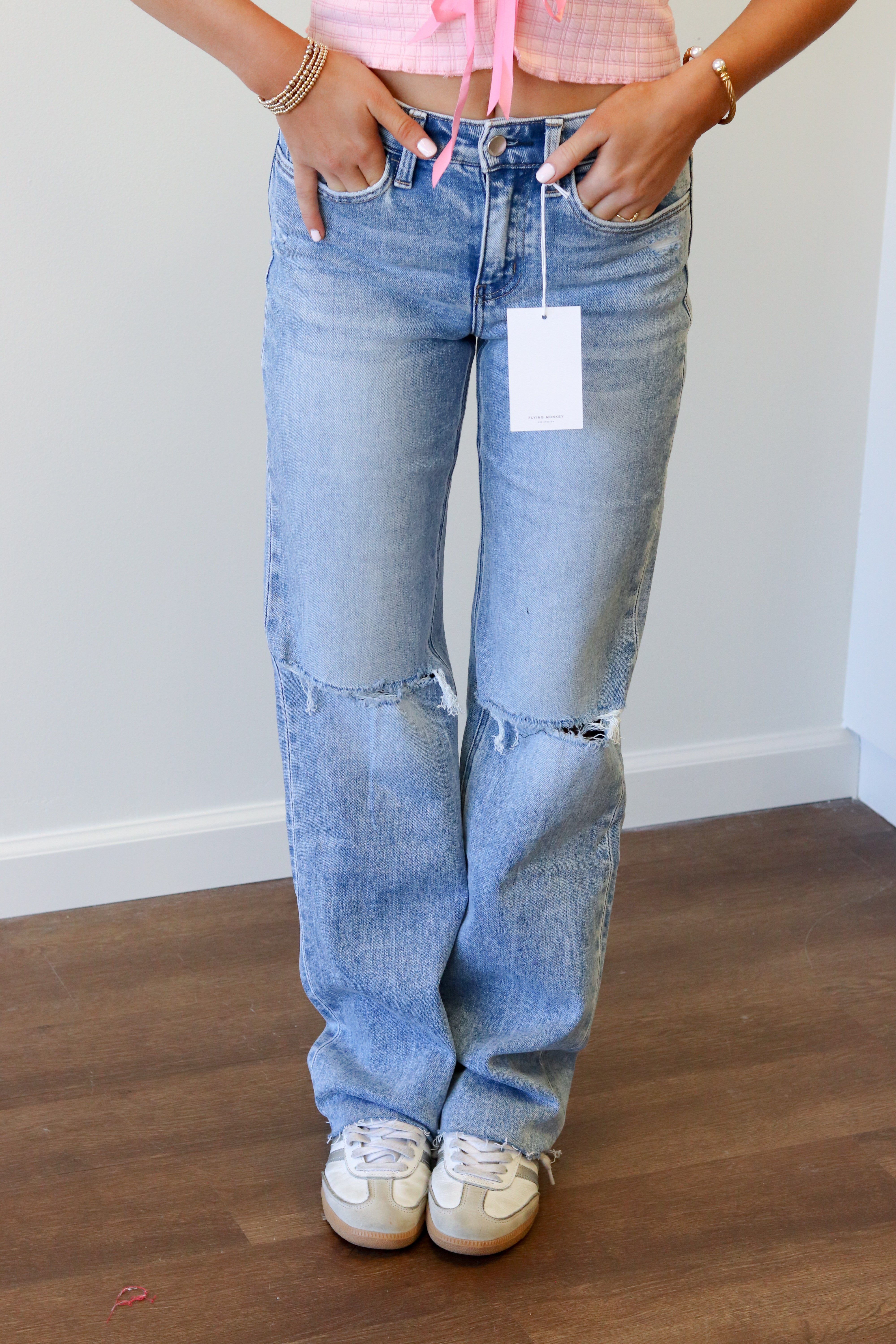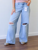 The Jadyn Jean is a modern denim staple designed with a flattering high-rise waist and a slim wide-leg silhouette. Crafted from comfort stretch denim, this pair features distressed detailing and a raw hem for an effortlessly cool, lived-in look. Full length and easy to style, Jadyn pairs perfectly with everything from fitted tops to relaxed layers.